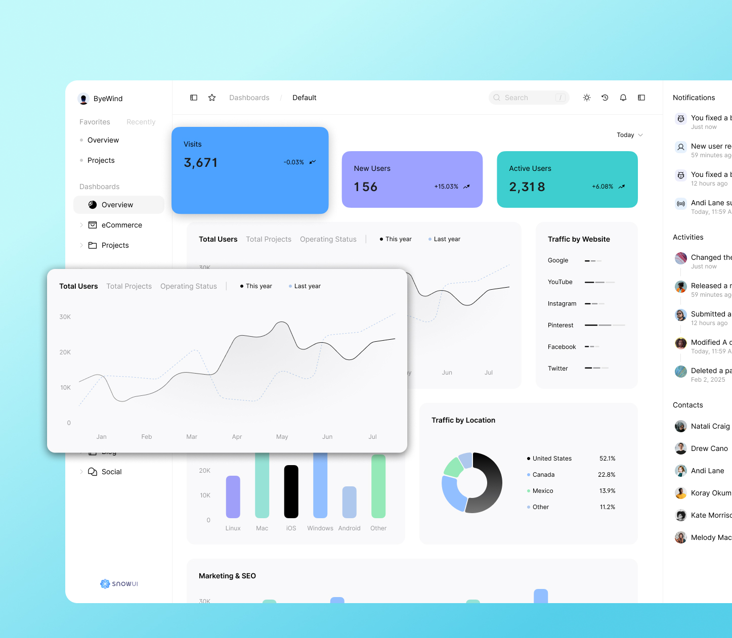 A modern social media management dashboard with analytics, sales tracking, and order management features.